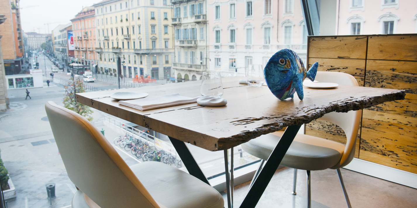 The restaurant is located on the second floor of the Eataly Smeraldo, overlooking the Piazza XXV Aprile. The dining room is bright and spacious; a large open kitchen sits just in front of a long sharing table, allowing guests to watch Viviana in action. Lovers of interior design will enjoy the tastefully designed décor; Riva 1920 solid oak tables are topped with beautiful tabletop sculptures, while handmade ceramics and abstract artworks line the walls.